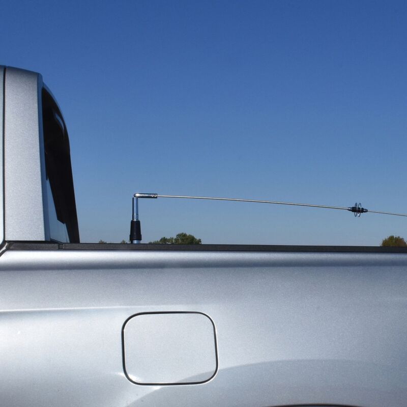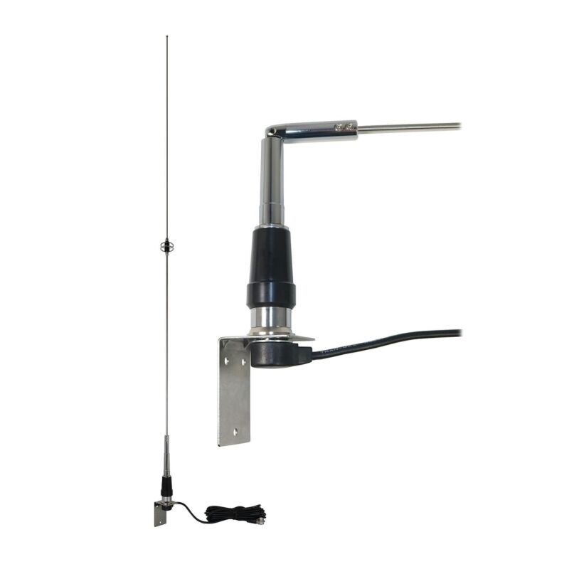 • 100-watt power rating;• 57-1/4 in. tall antenna ;• 5-1/8 in. tall when layed over;• No tuning needed;• DC ground 6/8 wave with C-Load;• Gold-plated contact pin;• SO-239 mounting;• SO-239 5/8 in. hole mount with 17-ft. RG-58A/U low-loss precision RF coax with tinned copper braid 95% shield, solid insulation, and stranded tinned copper center conductor;• Precision PL-259 UHF male connector installed with strain relief;• Includes 2-1/2-in. tall stainless steel 5/8-in. hole L bracket;